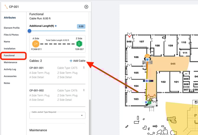 First, to ensure that your cable runs will populate in the Cables Report, be sure to add cables to the cable paths on your survey by opening the Element Info panel and clicking the "Add Cable" option under the Functional tab: