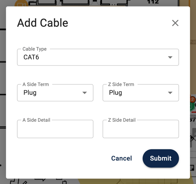 - This is where you can add your cable type, A side term and Z side term, as well as any additional detail: