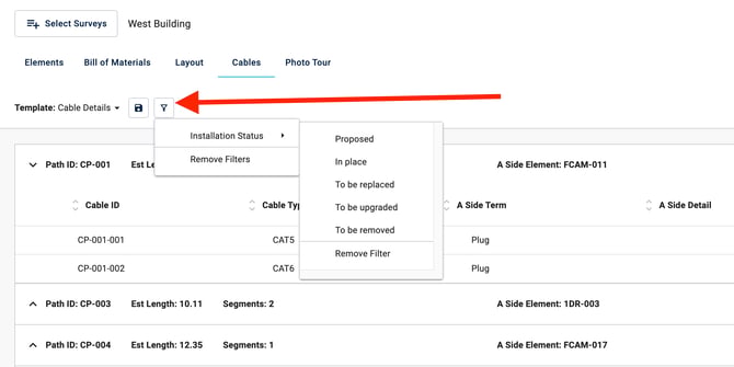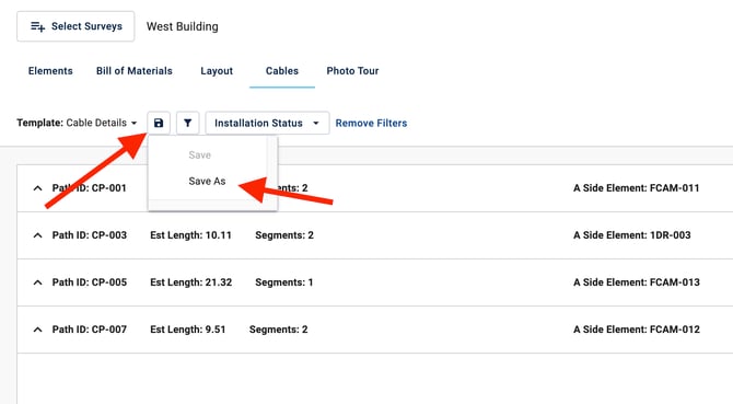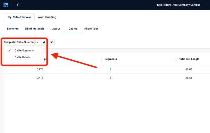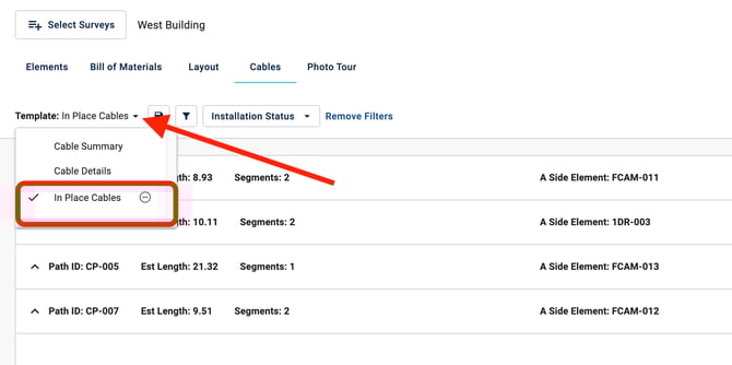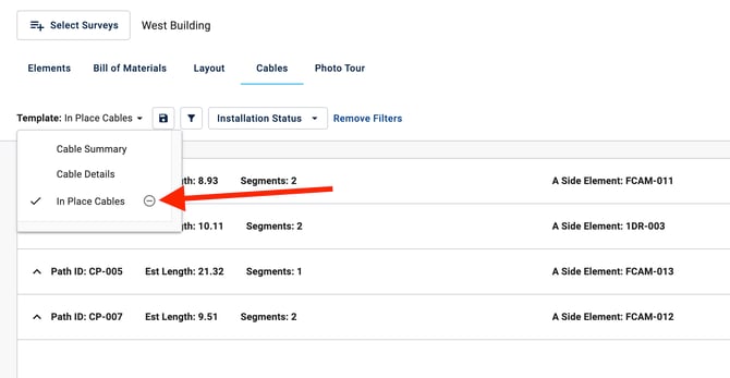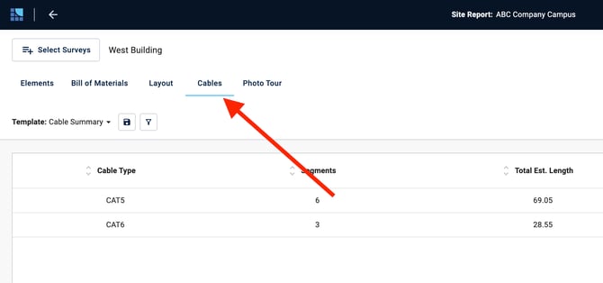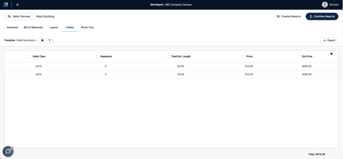 - The Cable Summary gives an overview of the different Cable Paths in your survey, including the number of cables per element, price per foot, and total price: