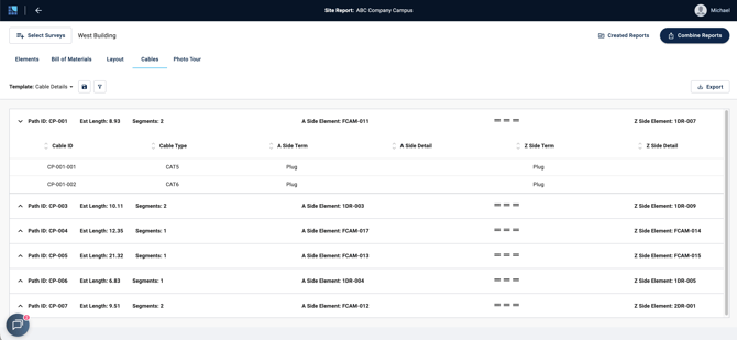 - The Cable Details provides a breakdown of each cable type including attached elements and connections: