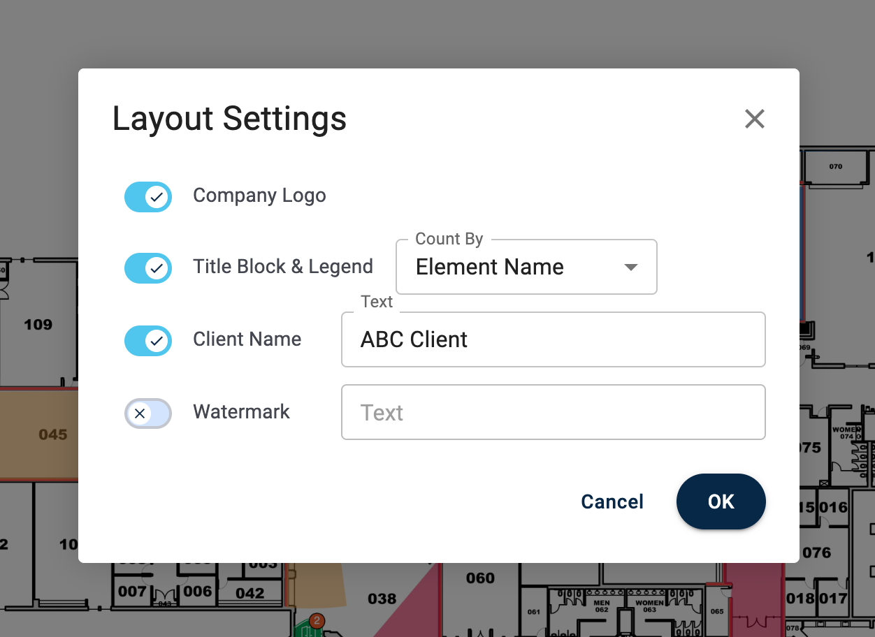 - Here, you can add your Company Logo, a Title Block and Legend, your Client Name or a custom watermark if you are on the enterprise plan: