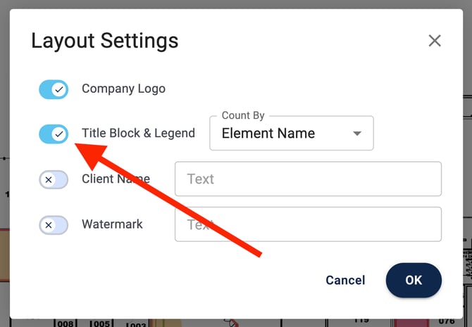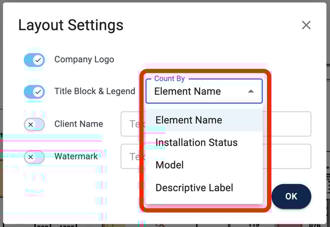 - You can choose to have the Legend count by Element Name, Installation Status, Model, or Descriptive Label: