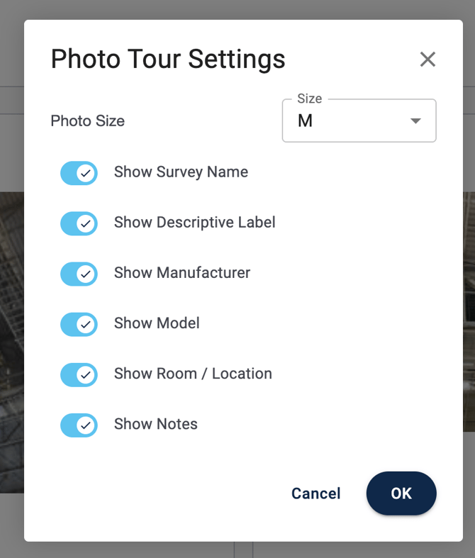 - Here, you can choose the photo size, and add or remove Element Attributes from the report, including any Notes that you have added to your Elements