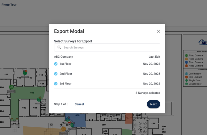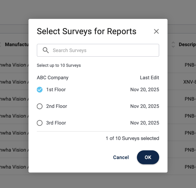 - Select which Surveys you would like to view in the report by clicking the "Select Surveys" button (up to 10 Surveys can be selected):